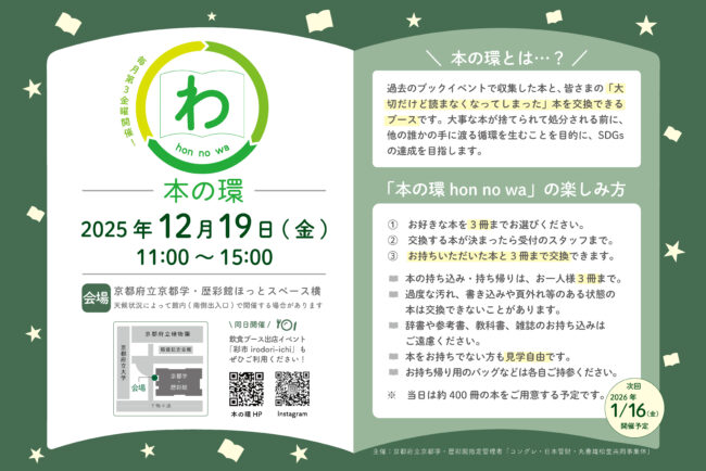 日時 2025年12月19日(金) 11:00~15:00 会場 京都府立京都学・歴彩館 ほっとスペース横(屋外)、天候状況によっては館内(南側出入口) 問い合わせ先 代表電話(075-723-4831)