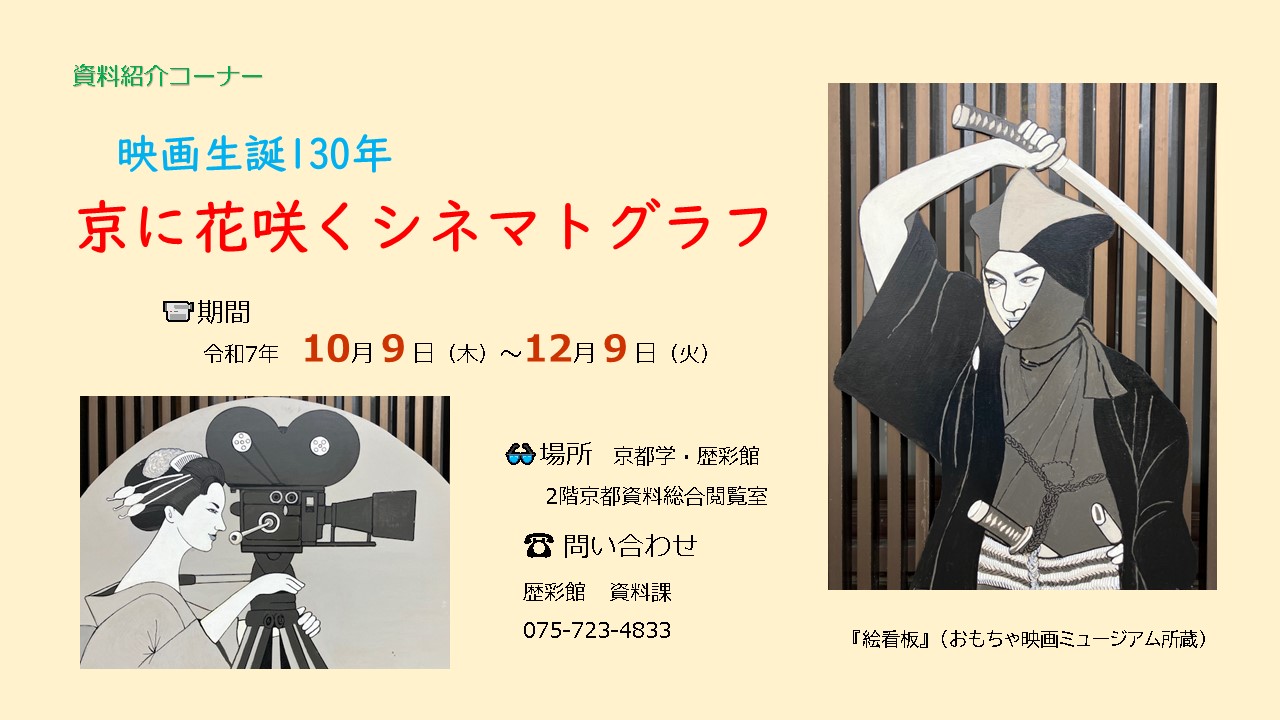 京都資料総合閲覧室 展示 開催中 【10月9日~12月9日】資料紹介コーナー「京に花咲くシネマトグラフ」 開催日: 2025年10月9日 - 2025年12月9日カテゴリー: 京都資料総合閲覧室, 展示, 開催中 資料紹介コーナーは2階京都資料総合閲覧室でご覧いただけます。 ▶ 資料紹介リストはこちらからご覧いただけます。 日時 2025年10月9日(木)~12月9日(火) ※開館日/開館時間に準じる 会場 2階 京都資料総合閲覧室 お問合せ:資料課(資料サービス) 075-723-4833