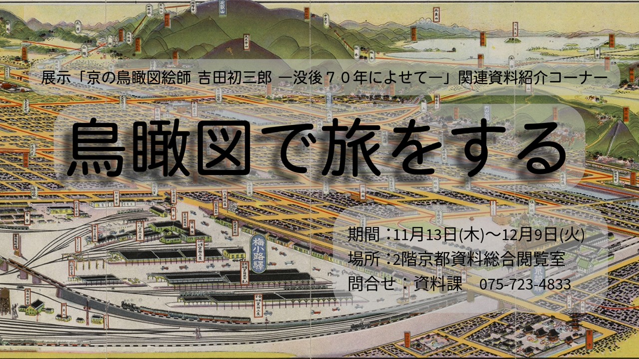 京都資料総合閲覧室 展示 開催中 【11月13日~12月9日】資料紹介コーナー「鳥瞰図で旅をする」 開催日: 2025年11月13日 - 2025年12月9日カテゴリー: 京都資料総合閲覧室, 展示, 開催中 資料紹介コーナーは2階京都資料総合閲覧室でご覧いただけます。 ▶ 資料紹介リストはこちらからご覧いただけます。 日時 2025年11月13日(木)~12月9日(火) ※開館日/開館時間に準じる 会場 2階 京都資料総合閲覧室 お問合せ:資料課(資料サービス) 075-723-4833