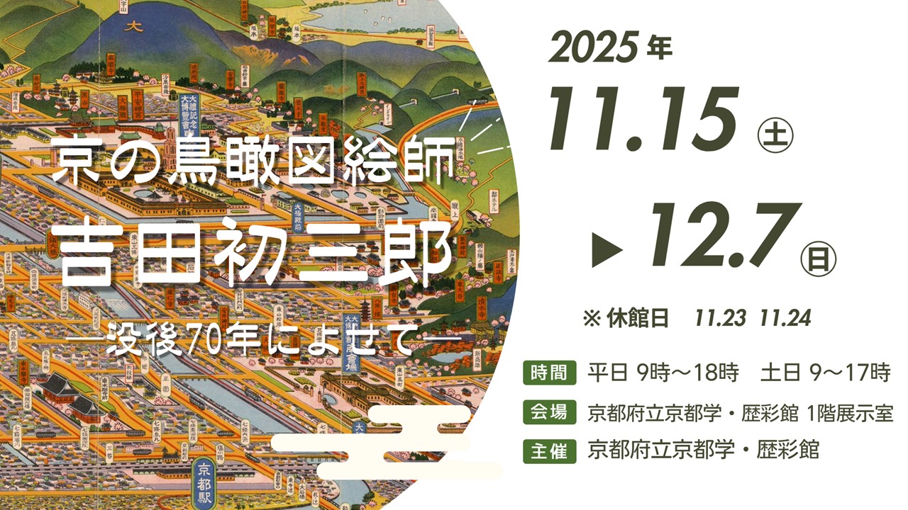 予告 展示 展示室 【11月15日~12月7日】「京の鳥瞰図絵師 吉田初三郎 ―没後70年によせて―」 開催日: 2025年11月15日 9:00 AM - 2025年12月7日 5:00 PMカテゴリー: 予告, 展示, 展示室 日本各地の観光地や都市を独自のデフォルメで描き出し、「大正の広重」と称された京都出身の鳥瞰図絵師、吉田初三郎。本展示では、当館所蔵の吉田初三郎作品の中から、特に京都にまつわる作品を中心に紹介します。 日時 2025年11月15日(土) ~ 2025年12月7日(日) ※休館日を除く [平日] 9:00~18:00 [土日] 9:00~17:00 会場 1階 展示室 ※入場無料 チラシ PDFで見る