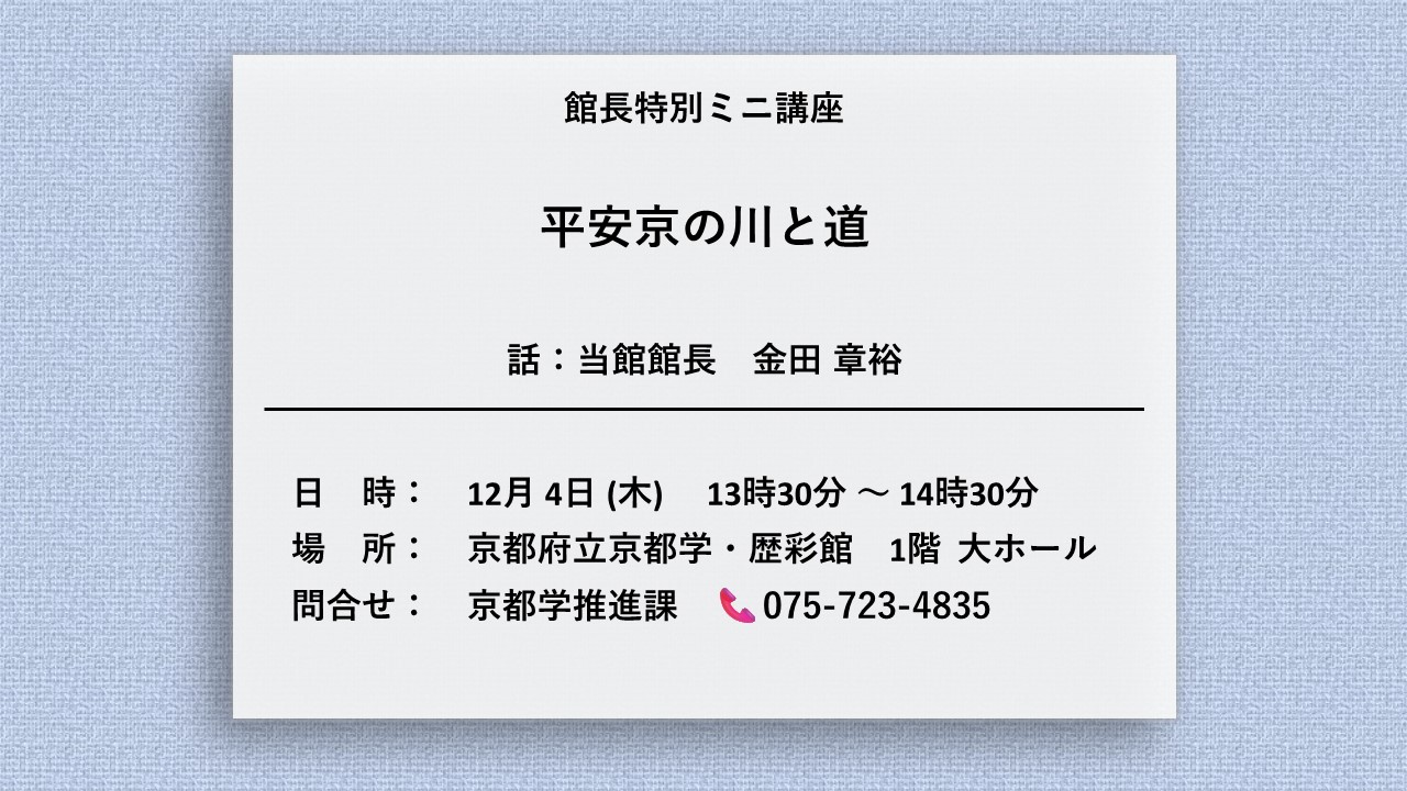 大ホール 当日参加OK 講演・講座・レクチャー 【12月4日】館長特別ミニ講座「平安京の川と道」 開催日: 2025年12月4日 1:30 PM - 2:30 PMカテゴリー: 大ホール, 当日参加OK, 講演・講座・レクチャー 歴史地理を専門とする金田館長が、平安京の鴨川・桂川や街路について、解説します。 日時 2025年12月4日(木) 13:30~14:30(受付開始 13:00) 会場 1階 大ホール 定員・対象 当日受付・無料 講師 金田 章裕(当館館長) 主催 お問合せ先 京都学推進課(075-723-4835)