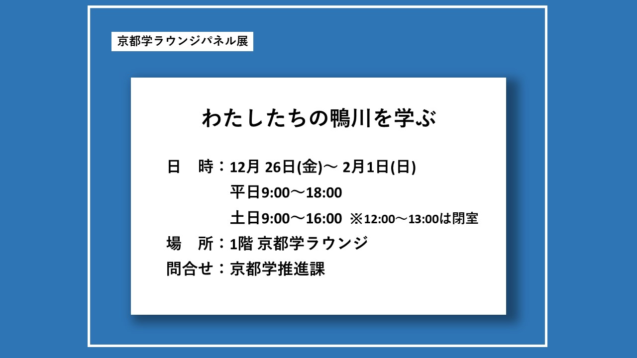 予告 京都学ラウンジ 展示 【12月26日~2月1日】京都学ラウンジパネル展「わたしたちの鴨川を学ぶ」 開催日: 2025年12月26日 9:00 AM - 2025年12月27日 6:00 PMカテゴリー: 予告, 京都学ラウンジ, 展示 京都の歩みとともに絶え間なく流れる鴨川。鴨川流域ネットワーク設立10周年を記念し、鴨川の歴史と文化的価値を紹介します。 日時 2025年12月26日(金)~2026年2月1日(日) 【休館日を除く】 平日 9:00~18:00 土日 9:00~16:00 (土日12:00~13:00は閉室) ※2025年12月28日(日)~2026年1月4日(日)は休館日です。 会場 1階 京都学ラウンジ