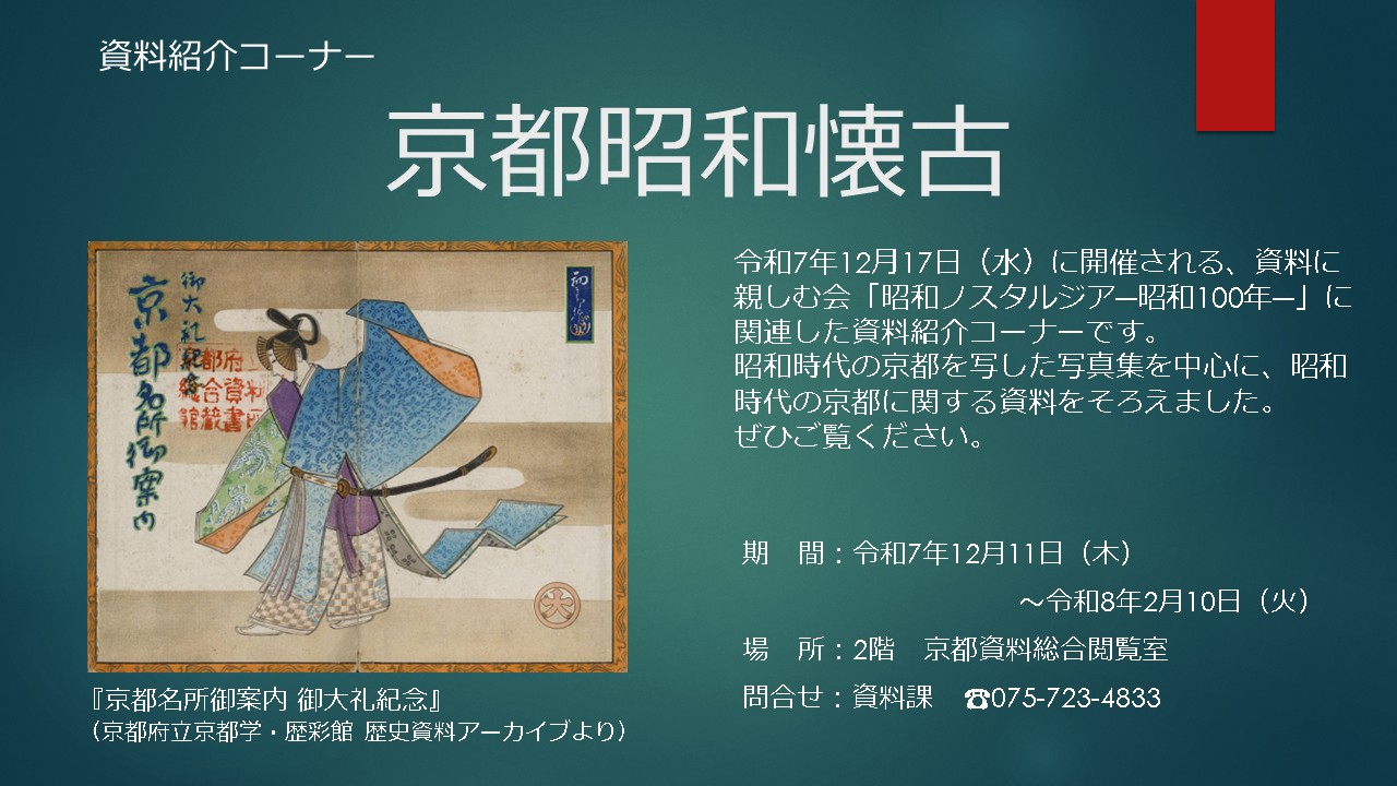 京都資料総合閲覧室 展示 開催中 【12月11日~2月10日】資料紹介コーナー「京都昭和懐古」 開催日: 2025年12月11日 - 2025年12月27日カテゴリー: 京都資料総合閲覧室, 展示, 開催中 資料紹介コーナーは2階京都資料総合閲覧室でご覧いただけます。 ▶ 資料紹介リストはこちらからご覧いただけます。 ▶関連講座 【12月17日】資料に親しむ会「昭和ノスタルジア―昭和100年―」 日時 2025年12月11日(木)~2026年2月10日(火) ※開館日/開館時間に準じる ※2025年12月28日(日)~2026年1月4日(日)は休館日です。 会場 2階 京都資料総合閲覧室 お問合せ:資料課(資料サービス) 075-723-4833