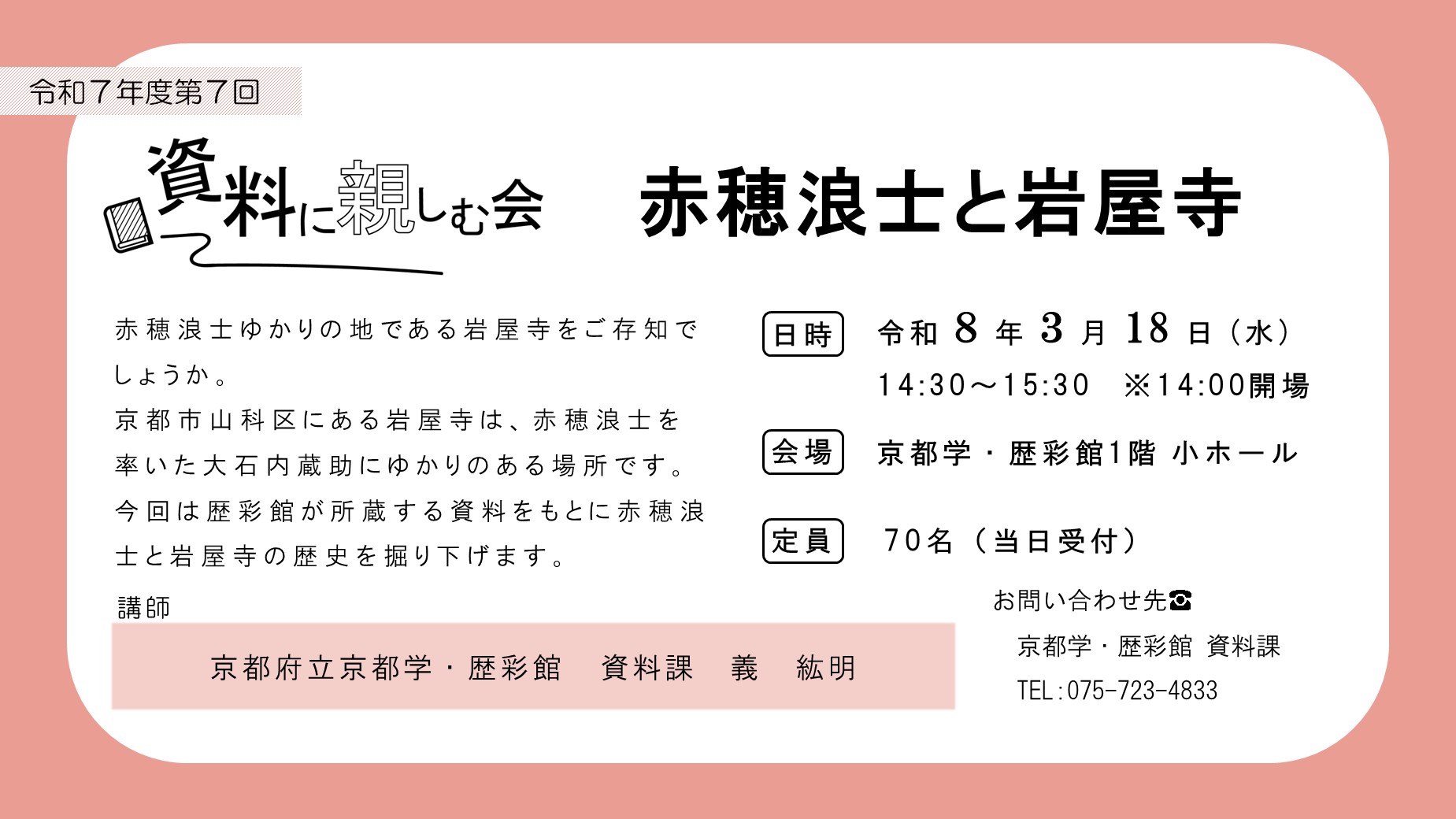 小ホール 当日参加OK 講演・講座・レクチャー 【3月18日】資料に親しむ会「赤穂浪士と岩屋寺」 開催日: 2026年3月18日 2:30 PM - 3:30 PMカテゴリー: 小ホール, 当日参加OK, 講演・講座・レクチャー 赤穂浪士ゆかりの地である岩屋寺をご存知でしょうか。 京都市山科区にある岩屋寺は、赤穂浪士を率いた大石内蔵助にゆかりのある場所です。 今回は歴彩館が所蔵する資料をもとに赤穂浪士と岩屋寺の歴史を掘り下げます。 日時 2026年3月18日(水) 14:30~15:30(受付開始 14:00) 会場 1階 小ホール 定員・対象 70名(当日受付・無料) 講師 義 紘明(資料課) 主催 お問合せ先:資料課(075-723-4833) チラシ PDFで見る